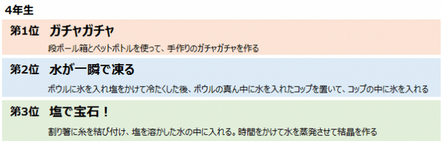 2014年~2018年のキッズ@nifty「みんなの自由研究紹介広場」コーナーに投稿された自由研究で、「やってみようと思う!」の感想の登録が多かったものを小学校1年生~6年生の学年別に集計