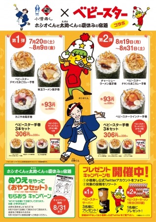 株式会社おやつカンパニー(本社所在地:三重県津市 代表取締役社長:手島文雄)は、株式会社小僧寿し(本社所在地:東京都中央区 代表取締役社長:小林剛)が展開する持ち帰り寿しチェーン『小僧寿し』にて、2019年7月20日(土)から8月31日(土)までの期間限定で、「ベビースターラーメン(チキン味)」「ベビースター焼そば(ソース味)」を使ったコラボメニューを展開します(準備数がなくなり次第終了)。さらに期間中は、SNSでのプレゼントキャンペーンや、「夏休みの宿題」としての「ぬりえ」の企画も開催します。