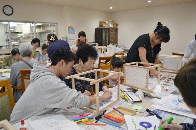 この行灯製作のイベントは、昨年に続き2回目の開催となり、当日は当住宅の入居者11名、併設の認可保育園「ココファン・ナーサリー西船橋」2歳児クラスの園児4名、千葉商科大学の学生5名の計20名が参加。当住宅の共用食堂を会場とし、行灯製作に取り組みました。参加者は枠を組み立てたり、絵を描いたりという作業に熱中。難しい作業などは、お互いに助け合うなどの姿も見られました。
