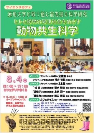 本学は地球共生系「One Health」という教育・研究の理念により、ヒトと動物の共生を科学する大学として、文部科学省私立大学研究ブランディング事業に2016年度に採択されました。今回のサイエンスカフェでは、研究プロジェクトの全体像と3本柱(3分野)について わかりやすく紹介し、参加者の皆さんの疑問に各グループのリーダーの研究者が直接お答えします。カフェタイムではドリンクとお菓子も用意され、動物との共生に関する知識を気軽に深める機会となります。