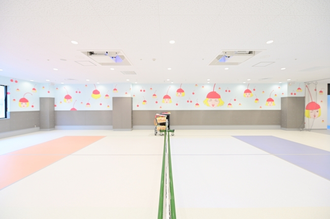 フロアいっぱいに広がるポップなデザインは、人気イラストレータ―竹井千佳さんが手がけました。ホワイトを基調とした室内に設けられたミニテニスコートと、それを取り囲むかわいらしいたくさんのイラストは、フォトスポットとしても楽しめます。