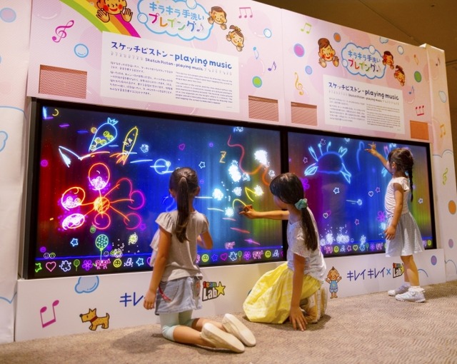 キレイキレイブースにて展示の「スケッチピストン - Playing Music」では、キレイキレイの泡スタンプや、ばい菌なども登場します。また、SNS連動型自撮りサイネージカメラ「チームラボカメラ(https://www.team-lab.com/teamlabcamera/)」による、「キレイキレイカメラ」も同時展示いたします。
