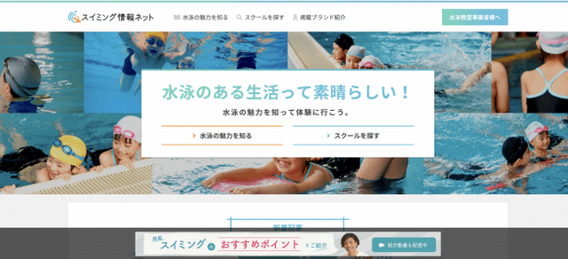 「スイミング情報ネット」は、水泳参加人口の最大化(水泳を始める機会最大化)を目的としたWEBプラットフォームです。水泳の魅力(潜在層向けコンテンツ)から水泳教室の情報(顕在層向けコンテンツ)まで一気通貫して提供します。