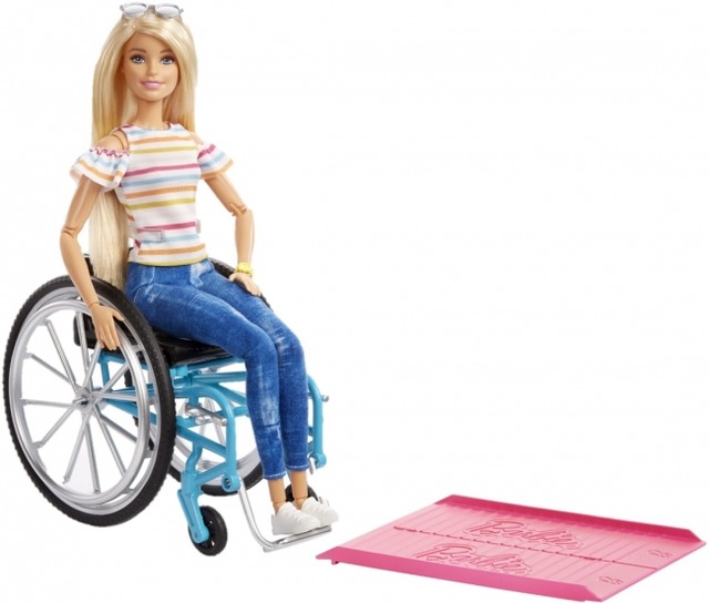 最先端のトレンドファッションをバービーと一緒に楽しめる「バービー ファッショニスタ」シリーズから登場した、車椅子に乗ったバービードールです。全身にジョイントがついたドールやタイヤを動かすことができる車椅子、ピンクのスロープがセットになっています。