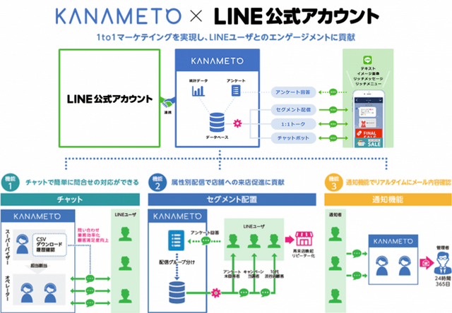 「KANAMETO」は、トランスコスモスとLINE株式会社、株式会社セールスフォース・ドットコムの合弁会社であるtranscosmos online communications株式会社が開発・提供する、LINE公式アカウント対応のカスタマーサポートツールです。LINEユーザと行う1対1のチャットコミュニケーションはもちろん、アンケート機能も備え属性にあわせたセグメント配信を行うことが可能です。LINEでのマーケティングからサポートまで、自治体や企業と消費者のコミュニケーションを支援しています。