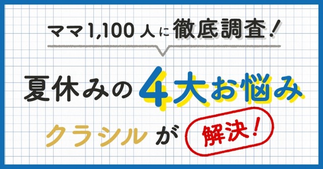 「くらしをおいしく、あたたかく」をコンセプトにするクラシルは、例年、夏になるとお子さまをお持ちの方が「お子さまの夏休みで家事・育児が大変!」という課題を抱えられていることに着目し、この度小学生以下のお子さまをお持ちのママ1,100人を対象に「子供の夏休みに大変なこと調査」を行いました。(以下、調査結果サマリ)