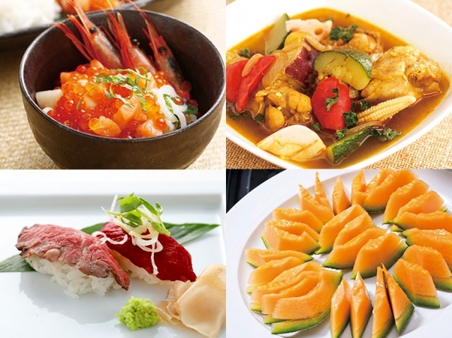 お好み海鮮丼、カニと白身魚のムース アメリケーヌソース、鮭と小海老のボン・ファン うに風味、たこザンギ、スープカレー、北海道チーズ(森のカムイ、あしょろチーズ工房 大)、北海道産メロン、シメパフェ など
