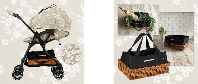 本製品は、ご注文を頂いてからお作りするオーダーメイドモデルで、リネンを使用した(※1)シートや幌に刺繍を施しました。また、ベビーカーにポンと載せるだけの、皮付きの籐と持ちやすい布トートを組み合わせたかごバッグを標準装備。お出かけ先でベビーカーを畳んだ時もかごバッグ単体としてお使い頂けます。