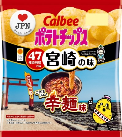 カルビーは、47都道府県の「地元ならではの味」を開発する「♥ JPN(ラブ ジャパン)」プロジェクトを発足し、2017年度、2018年度に47都道府県それぞれの地元の味を再現したポテトチップスを数量限定・期間限定で発売しました。3年目となる2019年度も、3回(第1弾、第2弾、第3弾)に分けて47都道府県の味のポテトチップスを順次発売します。2019年度の第1弾となる宮崎の味『ポテトチップス 辛麺味』は、地元を愛するお客様からインターネット上で募集した味案をもとに、宮崎県庁にて地元を愛する皆様と一緒にワークショップや試食会を行い、味やパッケージを決定しました。お客様からは、2017年度の「チキン南蛮味」、2018年度の「日向夏味」に続く味案として、「冷や汁」や「地鶏の炭火焼」等のアイデアも出されましたが、ポテトチップスとしての実現性や相性の良さと話題性から、お客様の声に応えるべく商品化しました。
