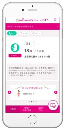 那須町に採用された『Hapi NASUダイアリー』は、スマートフォン・タブレット端末・PCに対応したサービスで、妊産婦と子どもの健康データの記録・管理や予防接種のスケジュール管理、出産・育児に関するアドバイスの提供など、育児や仕事に忙しい母親や父親を助けてくれる便利な機能が充実しています。