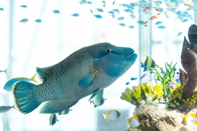 銀座の夏の風物詩「Sony Aquarium」が、今年も始まりました。額のコブがナポレオンの帽子のように見えることからナポレオンフィッシュの名称で知られるメガネノモチウオや、沖縄美ら海水族館で生まれた全長1.2mのオオテンジクザメなど、沖縄の"美ら海"からやってきた色彩豊かな生きものたち27種類約1,000匹が大水槽を泳ぎ回り、都会の真ん中に涼を呼ぶ景色をつくっています。お客様からも「毎年楽しみにしている」「きれいにお魚が見られてよかった」「餌付けや週末の説明がおもしろかった」といったご好評の声をいただいています。