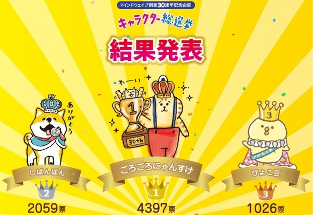 マインドウェイブは2020年に創業30周年を迎えることを記念して、2019年4月26日(金)~2019年5月31日(金)まで『キャラクター総選挙』を実施。SNSでも話題の「ごろごろにゃんすけ」と「しばんばん」が見事1位と2位に輝きました。この結果を記念して、4月に大好評を博した「ごろごろにゃんすけ&しばんばんSHOP」をこの夏再び東京駅にて開催いたします。