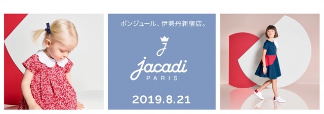 コーンズ・アンド・カンパニー・リミテッド(所在地:東京都港区、代表取締役社長:渡 謙作)が展開する、パリ生まれのキッズ&ベビーアパレルブランド「ジャカディ」は、2019年8月21日(水)から伊勢丹新宿店にて「ジャカディ POP UP SHOP 伊勢丹新宿店」を期間限定でオープンします。