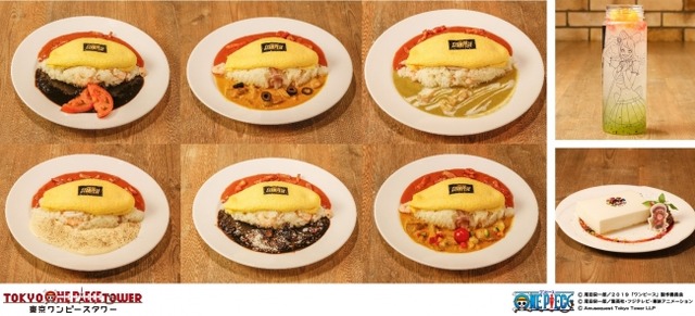 東京タワー1階「Cafe Mugiwara」と15時以降の「サンジのおれ様レストラン」では3品のメニューが登場。「“奇跡の共同戦線”オムカレー~立ち上がれ、全勢力。~」(1,600円税込)は、シーフードのオムライスとルフィをイメージしたレッドカレー&フライドベーコンをベースに、劇中で「共同戦線」に参戦するキャラクターをそれぞれイメージした6種類のカレーから1種類選び、自分だけの組み合わせをお楽しみいただけます。