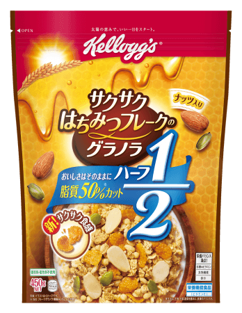 「グラノラハーフ」シリーズは、低脂肪の穀物を厳選し、おいしさはそのままに脂質を半分以下※に抑えヘルシーに仕上げた、ケロッグの中でも人気の高い製品です。新たにシリーズに加わる「サクサクはちみつフレークのグラノラハーフ」も、調合する油を極力カットし、ヘルシーに仕上げるだけでなく、6種のビタミン、鉄分、食物繊維を含み栄養バランスも満点です。
