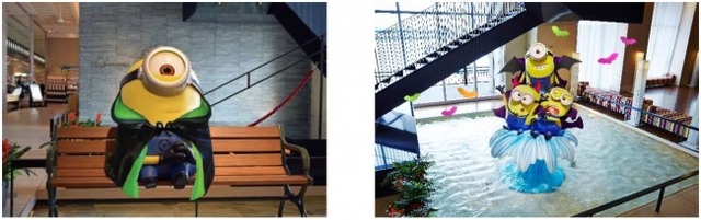 ロビーの「ミニオン」たちは、ドラキュラ風のマントを羽織り、コウモリの羽やデビルの耳、フランケンシュタインのようなボルトをつけて、それぞれがハロウィーンの仮装で大はしゃぎしています。
