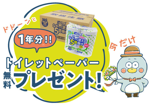増税前の今だけ!「超ロングながーく使える5倍巻きトイレットペーパー」1年分プレゼント!