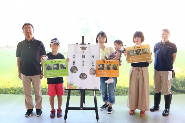 2019年9月7日(土)に命名式を開催し、名前を発表しました。「令」「和」「元」と応募していただいた方の中から選考により、福島県石川郡の芳賀 恵美子(はが えみこ) さん(25歳)を「令」の命名者として、福島県いわき市の 志賀 敏子(しが としこ)さん(39歳)を「和」の命名者として、千葉県千葉市の嶌田 葵月 (しまだ あいき)さん(11歳)を「元」の命名者としてご招待し、ユーラシアカワウソを展示している当館「カワウソのふち」コーナーで命名式を開催しました。命名者には生後30日と同じ重さに作られたオリジナルのユーラシアカワウソぬいぐるみをプレゼントしました。