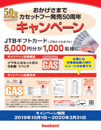 「カセットフー発売50周キャンペーン」(10/1~3/31締切)では、イワタニカセットガス3本組1パックをご購入いただいた方に、50周年にちなみ“5,000円分のJTBギフトカード”を抽選で1,000名様にプレゼントいたします。例年のキャンペーンを拡大し、当選者数を500名から2倍の1,000名に、応募条件をイワタニカセットガス3本組2パックから1パックに変更し、より多くの方に参加いただけるキャンペーンにいたしました。