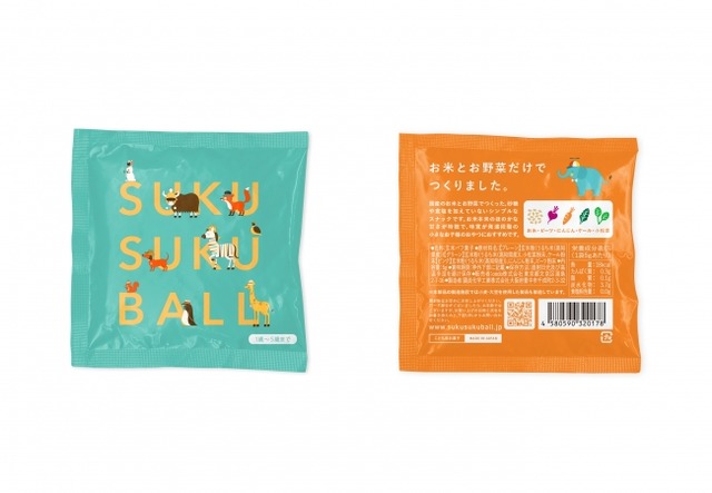 「SUKUSUKU BALL」は小さなお子様向けのお米を使用したパフ菓子です。 砂糖や食塩を加えておらず、化学農薬を使わず大切に育てられた高知県産の「鶴こい米(R)」とおやさいだけでつくっているため、お子様に安心して与えることができます。1袋に3色のパフがミックス。またお子様が手にとって遊びながらパクパク食べる未来を想定し、色々な動物が登場する可愛らしいパッケージに仕上げました。