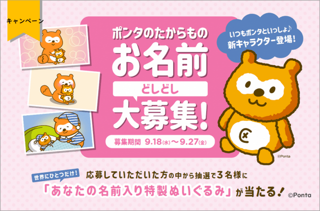 「ポンタのたからもの」はポンタが小さいころから、いつもそばにいて大切にしているぬいぐるみです。本キャンペーンでは、このキャラクターの名前を募集します。Ponta公式Twitter(@Ponta)をフォローし、対象ツイートに「ポンタのたからもの」の名前案をリプライすると応募できます。応募いただいた方の中から抽選で3名様にご希望のお名前を刺繍した特製「ポンタのたからもの」ぬいぐるみをプレゼントします。なお、決定した「ポンタのたからもの」の名前は2019年10月9日(水)にPonta公式Twitterにて発表します。