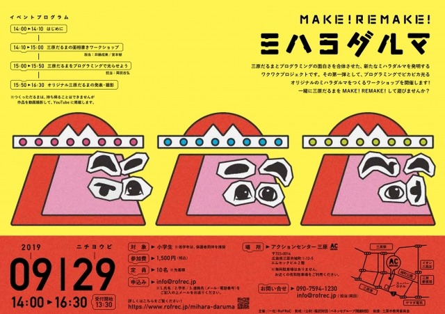 一般社団法人RoFReC(本社:広島県三原市、代表理事:岡田吉弘、以下、ロフレック)は、2019年9月29日(日)14時~16時半、アクションセンター三原(〒723-0014 広島県三原市城町1-12-5)にて、MAKE!REMAKE!ミハラダルマを開催します。
