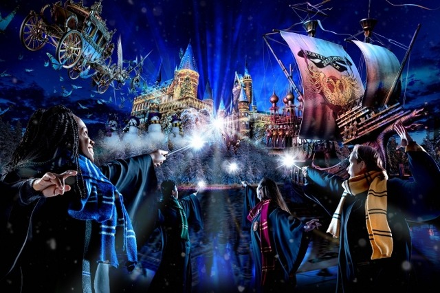 5周年を迎え、今もなお国内外のゲストから圧倒的人気を誇る『ウィザーディング・ワールド・オブ・ハリー・ポッター』に、今年も冬の季節が訪れます。聖なる夜に結成された、4人の生徒による魔法団が繰り広げる秘密の物語『ホグワーツ・マジカル・ナイト ~ウインター・マジック~』は、ホグワーツ城を舞台にした圧倒的なスケールのキャッスル・ショーです。また、雪に覆われた建物や屋根から垂れ下がったツララなど、細部にいたるまで圧倒的なクオリティで精巧に再現されたエリア内は、クリスマスのデコレーションに彩られ、この季節ならではの雰囲気があふれます。さらに、クリスマス期間限定『ホグズミード村の魔法のクリスマス・ツリー』や、魔法学校の生徒とカエルが奏でる素晴らしいハーモニーを堪能できるエンターテイメント『フロッグ・クワイア』のクリスマスバージョン、『ホットバタービール』をはじめとした冬季限定メニューなど、この季節だからこそ味わえる世界感にどっぷりと浸ることができます。5周年のラストを飾る冬だからこその大魔法物語で、ぜひ世界最高の感動をご体験ください。
