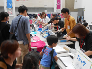 会場にはTシャツの他にも、その場で描いた絵で缶バッジを作成するコーナーや、自分の手形にデザインを施したステッカーを作成するコーナーがあり、子どもたちは楽しみながらものづくりの面白さを体感していました。缶バッジとステッカーづくりはイベントへの事前申し込みがなくても参加できたことから、当日フリーで参加した多数の親子が体験し、「Tシャツづくりがしたいので、来年はぜひ事前に申し込みたい」と残念そうに話をしてくれた子どももいました。
