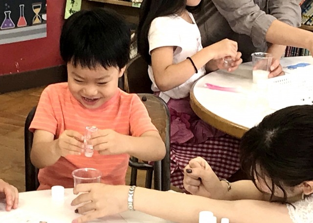 9組のご家族(大人9名、子供11名)が参加され、親子でコミュニケーションをとりながらオリジナル化粧品を作りました。子供が親の肌を実際に触り、どの様な肌状態かを確認して化粧品に配合する成分を決定する等、親子のコミュニケーションを生む機会を作ることで絆を深くすることへ繋げました。また、化粧品づくりの過程でサラサラの液体からゲルになる瞬間には子供達から歓声が上がり、お母さま方からも化粧品に関する質問が多く飛び交う等、活気ある体験会となりました。