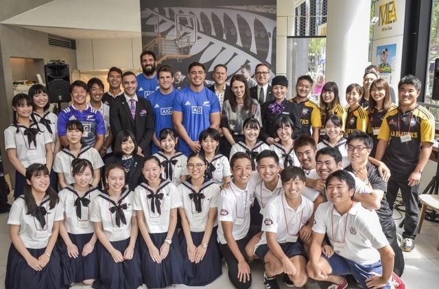 当日は、オールブラックスよりアントン・リナート-ブラウン選手、マット・トッド選手、サム・ホワイトロック選手が登場すると、大きな拍手で迎えられました。また、サプライズでニュージーランドのジャシンダ・アーダーン首相も選手の応援に駆け付けました。イベントには、高校生14名とラグビー部の大学生15名が参加し、選手、アーダーン首相へ英語での質問に挑戦したり、ゲームを行ったり、ニュージーランド産コーヒー「フラットホワイト」や、ニュージーランドでお馴染みのお菓子「パブロバ」などを楽しみました。