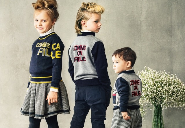 女児のロゴセーターは、身頃と袖を合わせることで「COMME CA FILLE」と読めるように設定されています。男児とベビーがお揃いで着ているロゴブルゾンは、リバーシブルで着ることができます。裏側はマルチボーダーになっており、表面と裏面をそれぞれ編み、最後にリンキングと呼ばれるニット生地に適した技法で合わせています。