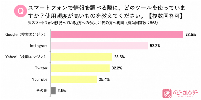 さらに、20~29歳のママに絞った調査結果では、「Instagram」の回答率は53.2%となり、「Yahoo!」を抜いて2位に浮上。なんと、20代ママの2人1人がInstagramで情報収集をしていることになります。