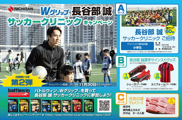 ニチバン株式会社(本社:東京都文京区、社長:高津敏明)は、「バトルウィン(TM)Wグリップ(TM)」購入者を対象に、長谷部誠サッカークリニックご招待やサイン入りグッズの他、米沢牛が当たる「Wグリップ(TM)長谷部誠サッカークリニックキャンペーン」を10月1日から11月30日まで実施します。