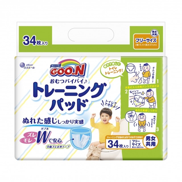 グ~ンのトレーニングパッドは、尿がモレにくい仕様となっているため、洋服や床を濡らす心配がありません。そして、今回のリニューアルで親子のコミュニケーションを促すデザインへと変更し、「親子で楽しみながらトイレトレーニングができる」仕様となりました。親からの声掛けを促すことで子どものやる気をアップさせ、親子の前向きなトイレトレーニングをサポートします。