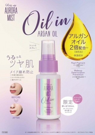 「Gloss me オーロラミスト オイルイン」は、肌にシュッ!とスプレーするだけで、ツヤ肌&メイク崩れ防止に加え、保湿もできるマルチスプレーです。従来の「Gloss me オーロラミスト」にアルガンオイルを2倍配合し、しっとりとした質感に仕上がっているので、これからの乾燥する季節にぴったりです。ポーチに入れて持ち運べる嬉しいミニサイズ。