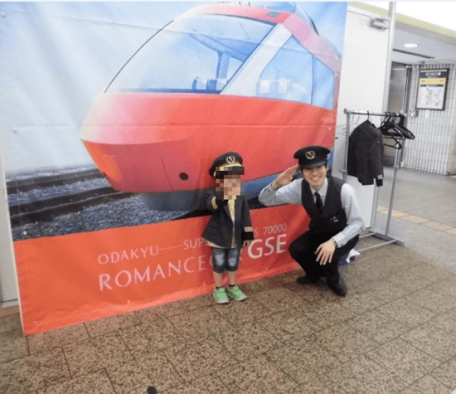 お子さま用の駅長制服を着用し、ロマンスカーパネルを背に写真を撮影いただけます。