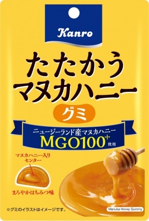 カンロの人気商品「たたかうシリーズ」から新たに発売される「たたかうマヌカハニーグミ」は、マヌカの花から採れる健康素材として注目度が高い特別なはちみつ「マヌカハニー」をおいしく手軽に摂れる、とろける味わいのグミです。