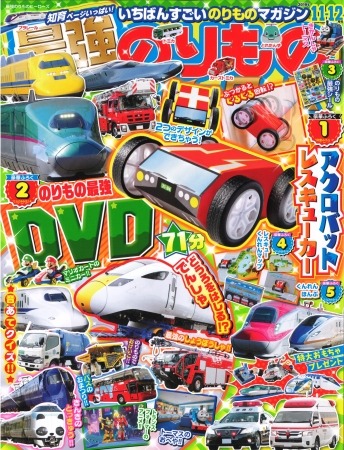 日本一のキッズ向けのりもの雑誌※『最強のりものヒーローズ』11-12月号は、前代未聞のおもしろミニカー「アクロバットレスキューカー」が付録で登場!! 走りながら壁にぶつかるとぐるぐるバク転する、すごい性能だぞ!!!