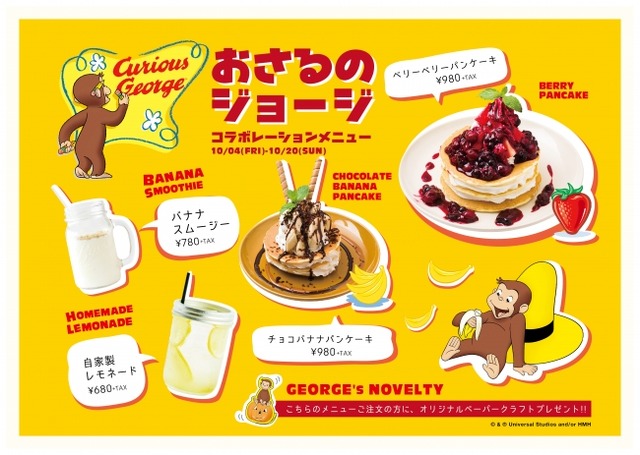 kawara CAFE&KITCHEN 吉祥寺PARCO店では、2019年10月4日(金)~20日(日)の期間限定で「おさるのジョージ」とのコラボレーションが決定いたしました。期間中は、アニメ「おさるのジョージ」のエピソードにちなんだメニューが登場し、該当メニューをご注文されたお客様には「オリジナルペーパークラフト」をプレゼントいたします。