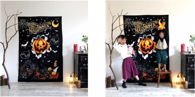 今年は、昨年も人気だったハロウィンタペストリーが2019年バージョンになって登場しました。昨年のお客様の声を基にサイズやデザインを考え、昨年よりもバージョンアップ。ジャック・オー・ランタンが迫力満点のタペストリーとなっています。インテリアとして飾るだけでなく、フォトブースとしてもご活用いただけます。