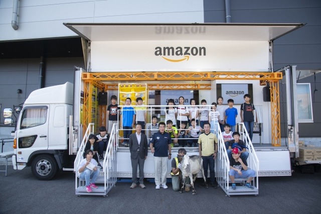 Mobile FCは、大型トラックを使用した、Amazonのテクノロジーやイノベーション、安全を最優先する働きやすい職場環境などを体験することができる体験学習車両で、今回、小学生向けの出張授業に、全国で初めて運用されました。展開されるコンテナ部分では、FCで実際に行われている商品の棚出しや梱包作業の体験や、自走式商品棚(ドライブとPOD)の原寸大の模型などに直接触れることが可能です。また、2020年より文部科学省が小学校でのプログラミング教育を全面実施することに先駆けて、STEM教育{Science(科学)、Technology(技術)、Engineering(工学)、Mathematics(数学)}の一環として、Amazon Roboticsの操作をプログラミング体験できるワークショップの実施も可能となっています。