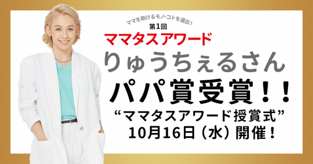 ママをたすける活動をした素敵なパパ部門には「りゅうちぇる」さんが受賞しました。授賞式にご登場頂きパパとしての想いなどをお話していただく予定です。