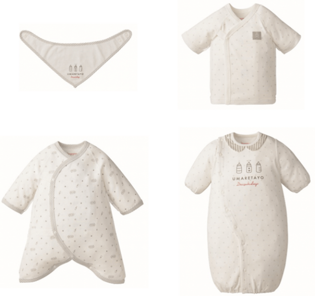 本商品は、10月10日の「赤ちゃんの日」を記念して開発した、新生児のための出産準備用品です。生まれてくる赤ちゃんに必要な「短肌着」、「コンビ肌着」、「ドレスオール」、「スタイ」の4点がセットになっています。