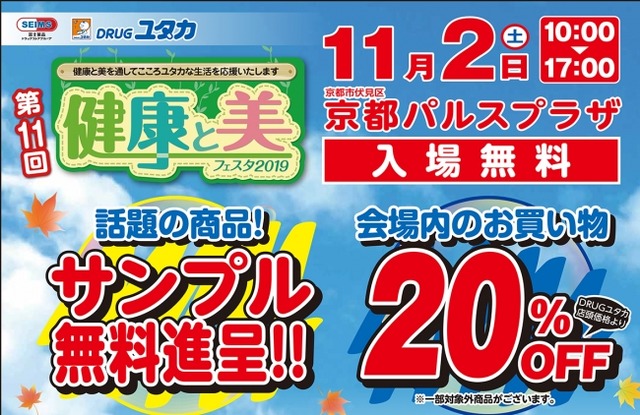毎年恒例の DRUGユタカ「第11回 健康と美フェスタ2019」を11月2日(土)京都パルスプラザにて開催します。