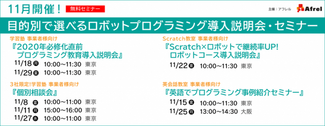 株式会社アフレル(福井県福井市、代表取締役社長:小林靖英、以下「アフレル」)は、事業拡大を目指す教育事業者様を対象としたこども向けロボットプログラミング教育事業の支援を行なっております。この度、学習塾事業者様を対象に「2020年必修化直前プログラミング教育導入説明会」を、11月18日(月)と11月29日(金)の2回、東京にて開催いたします。「クラス編成はどうしたらいい?」「講師育成は?」「独自ブランドでの開設は可能?」など、様々な疑問・ご質問にお答えします。さらに、3社限定の個別相談会も実施いたします。