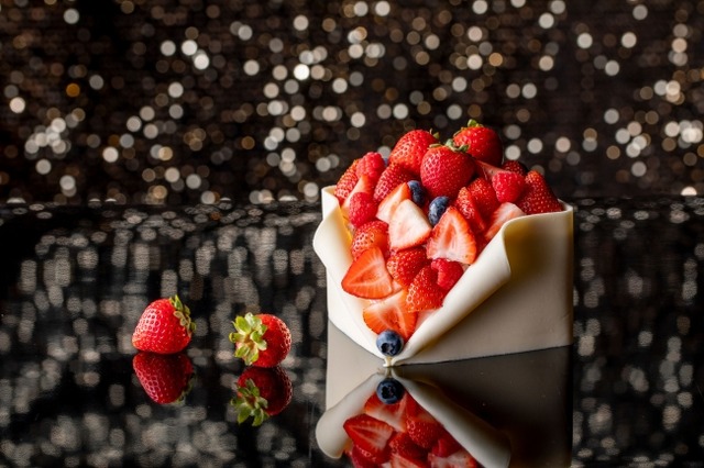 「あまおう」いちご、ラズベリー、ブルーベリーなどを贅沢に使ったショートケーキ。ギフトボックスのような側面はホワイトチョコレートでできています。きめ細かく、しっとりと焼き上げたスポンジケーキの間には、ふんわり軽やかなホイップクリームといちごをはさんで仕上げました。今年はより多くの皆さまにお楽しみいただけるよう3つのサイズでご提供します。