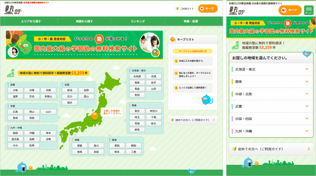 都道府県のトップページを追加いたしました。これにより、お住まいのエリアを中心として、身近な塾情報を簡単に探せるようになりました。