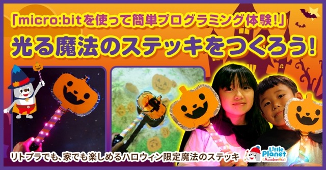 今回のイベントでは、手のひらサイズのコンピューター「micro:bit」にLEDテープの点灯機能を自分でプログラミングして、カボチャ型の「光る魔法のステッキ」を作ることができます。ステッキを持つ角度や周囲の明るさに応じて光の色が変化するほか、リトルプラネットのAR砂遊びアトラクション「SAND PARTY!」で砂場にステッキをかざすと、カボチャが飛び出す限定エフェクトを楽しむことができます。
