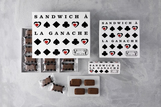 資生堂パーラー定番の洋菓子シリーズより、ひとくちサイズのリッチなチョコレート菓子「ラ・ガナシュ」の発売25年を記念し、ラ・ガナシュをアレンジしたサンドクッキーに仕立てました。ココアクランチを加えたなめらかなチョコレートを丁寧に焼き上げたビスキュイでサンドし、ひとつひとつ個包装。サンドされたチョコレートの濃厚ながらも軽い口どけと、さくさくのビスキュイの食感のバランスをお楽しみください。パッケージも発売当時の「ラ・ガナシュ」のデザインイメージを取り入れ、ハートやスペードなどが並びます。