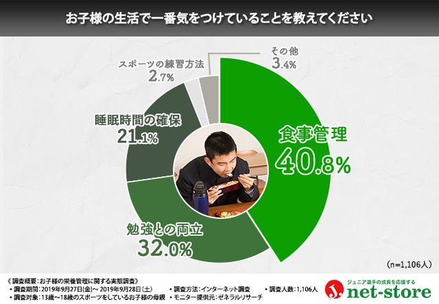 まず、「お子様の生活で一番気をつけていることを教えてください」と質問したところ、『食事管理(40.8%)』という回答が最も多く、次いで『勉強との両立(32.0%)』『睡眠時間の確保(21.1%)』と続きました。